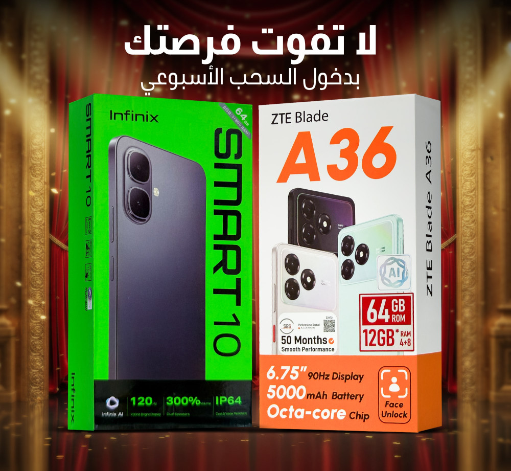 السحب الأسبوعي 1. اشتري جهاز موبايل واحصل على قسيمة لدخول السحب على جائزة الأولى 🔸هاتف Infinix Smart 10 أيضاً سيدخل اسمك تلقائياً معنا في السحب على الجائزة الكبرى في نهاية الموسم 2.عند قيامك بأي عملية شراء ( اكسسوارات - خط تركي جديد) أو قيامك بطلب أي خدمة ( تحويل رصيد تركي - صيانة - سوفت وير) واحصل على #قسيمة لدخول السحب على الجائزة الثانية هاتف ZTE A36